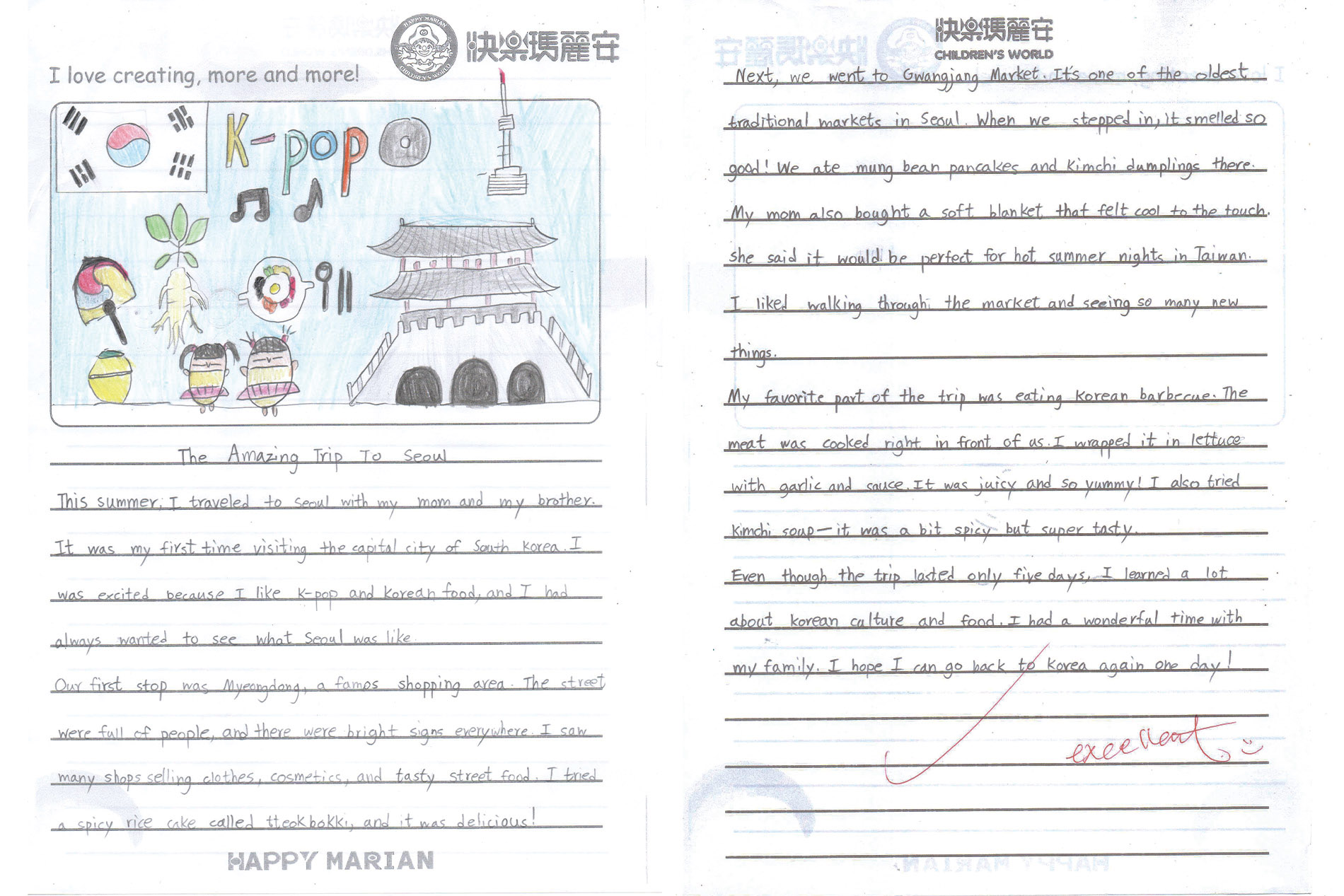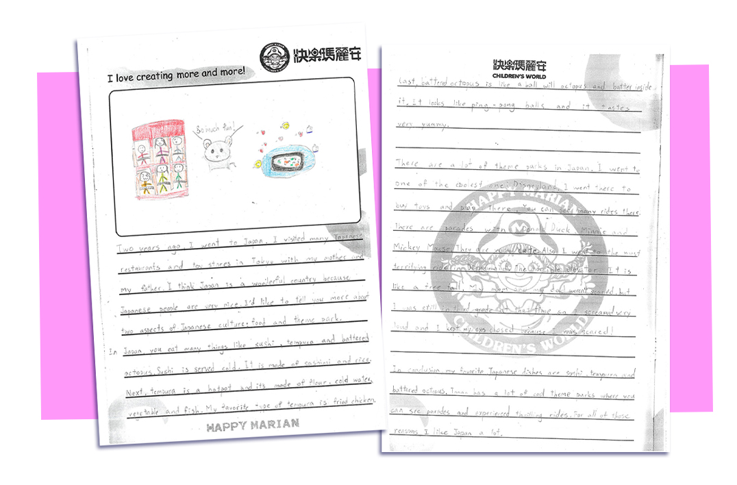 我們的驕傲 家長見證 作品SHOWCASE The Amazing Trip to Seoul This summer, I traveled to Seoul with my mom and my brother. It was my first time visiting the capital city of South Korea. Types of food P6 Phoebe I think everyone has a favorite food in the world. Do you want to know my favorite food in the world? The Moon and the Stars P4 Greta The moon up high, so soft and bright,Glows gently in the quiet night. A Place that Changed My Life AT1 Sophia Do you believe in miracles? If not, let me tell you a true story that will make you believe in miracles. There was a little girl, who was extremely shy and timid. My Favorite Basketball Player P6 Jim Lin My favorite basketball player is Luka Doncic. He is an NBA basketball player who was born in Slovenia. ... My Favorite Country P5 Sophie Two years ago, I went to Japan. I visited many Japanese restaurants and toy stores in Tokyo with m... 123